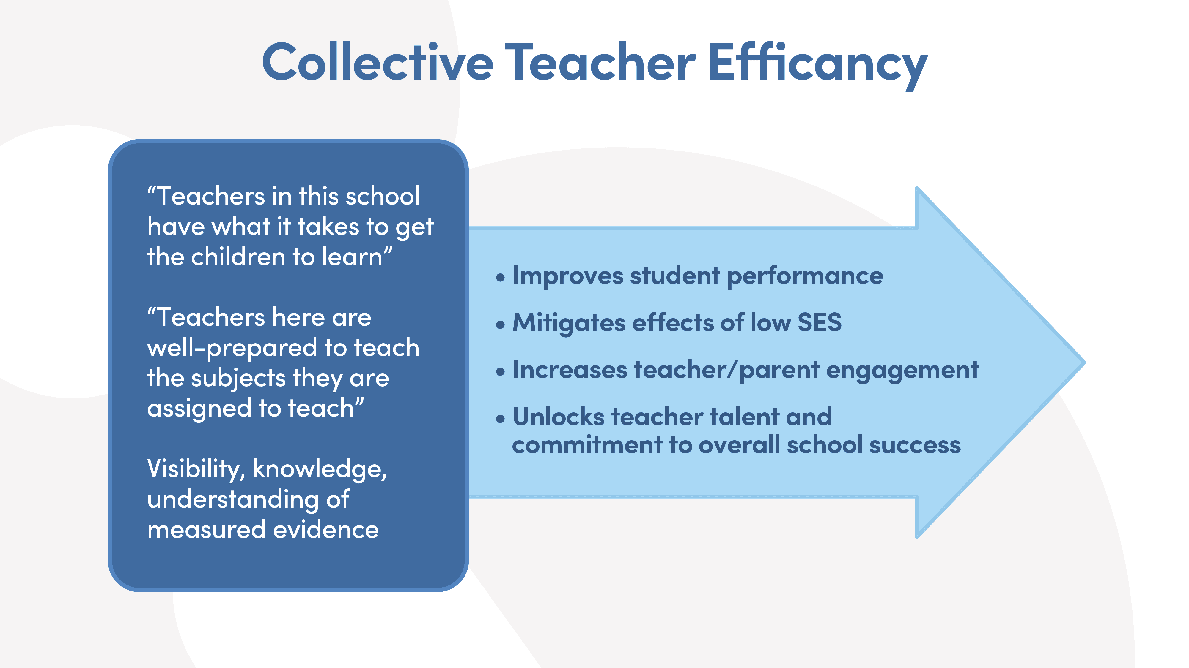 This is more than a shared positive mindset about students. When teachers actively hold one another accountable and consistently provide evidence of impact to one another, the research suggests something striking: outside forces like low socioeconomic status, low parental involvement, and teacher burnout are mitigated and, in some cases, eliminated.